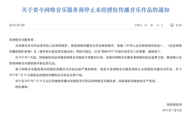 2015年,国家版权局下发《关于责令网络音乐服务商停止未经授权传播音乐作品的通知》,并要求7月31日前将未经授权传播的音乐作品全部下线,都则国家版权局将依法从严查查处。