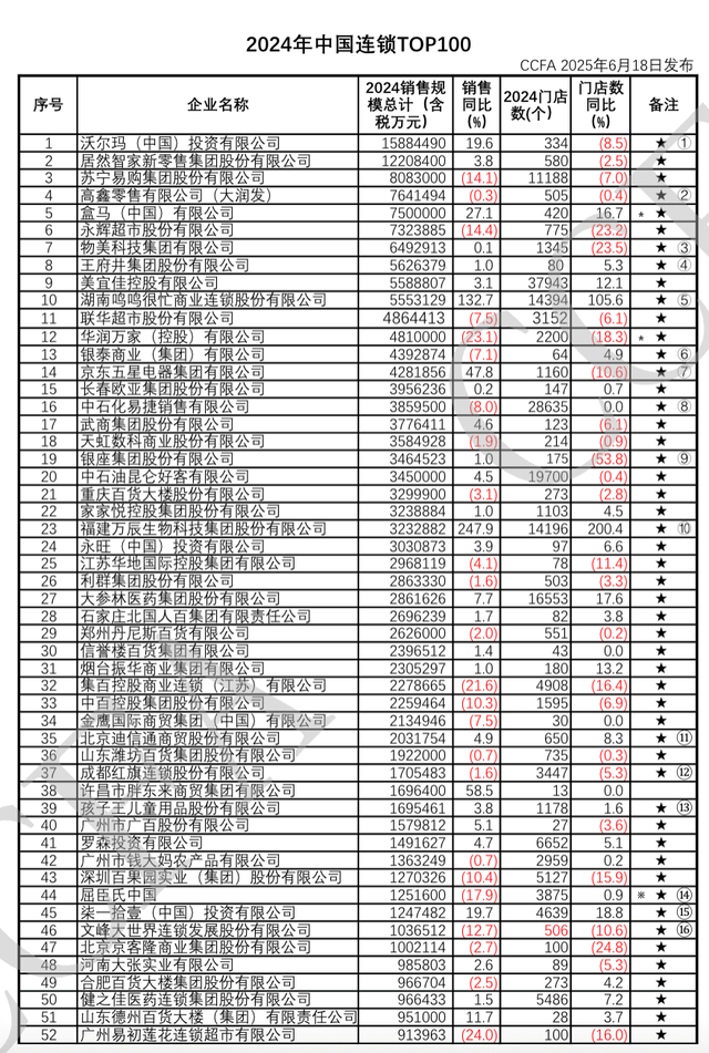 2024年中国连锁Top100前52位 | 来源:中国连锁经营协会
