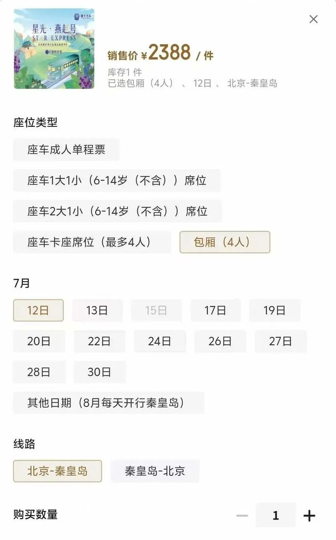 列车开往承德和秦皇岛两个方向,目前可以预定7月12日起,北京到秦皇岛往返的坐席,成人单程票的价格是375元,最贵包厢4人位总价时2388元。北京到秦皇岛常规高铁价格在160元左右。