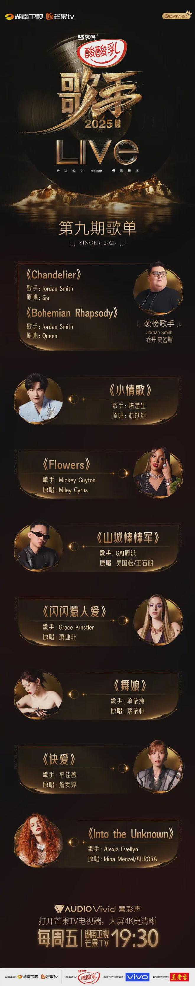 7月11日,湖南卫视《歌手》官方微博发布了《歌手2025》第九期完整歌单: