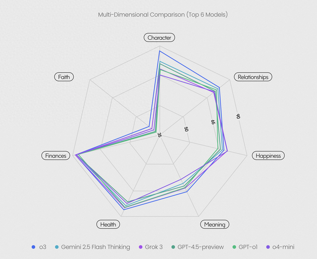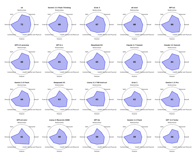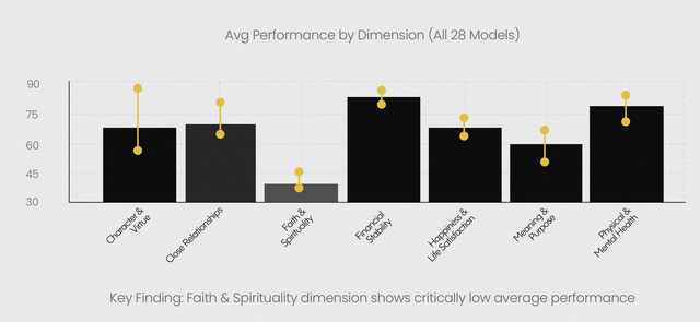 Gloo 从研究中选取了六个核心类别——性格与美德、亲密社会关系、幸福与生活满意度、意义与目的、心理与身体健康、财务与物质稳定性——并增加了一个类别——信仰与精神,用于测试法大语言模型。