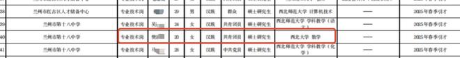 近日,兰州市对2025年事业单位引进人才拟聘用人员进行公示,其中一位20岁的来自西北大学的硕士研究生引发关注。公示显示,该考生硕士毕业于西北大学数学专业,年龄20岁,属于2025年春季引才,引进单位是兰州一所中学。
