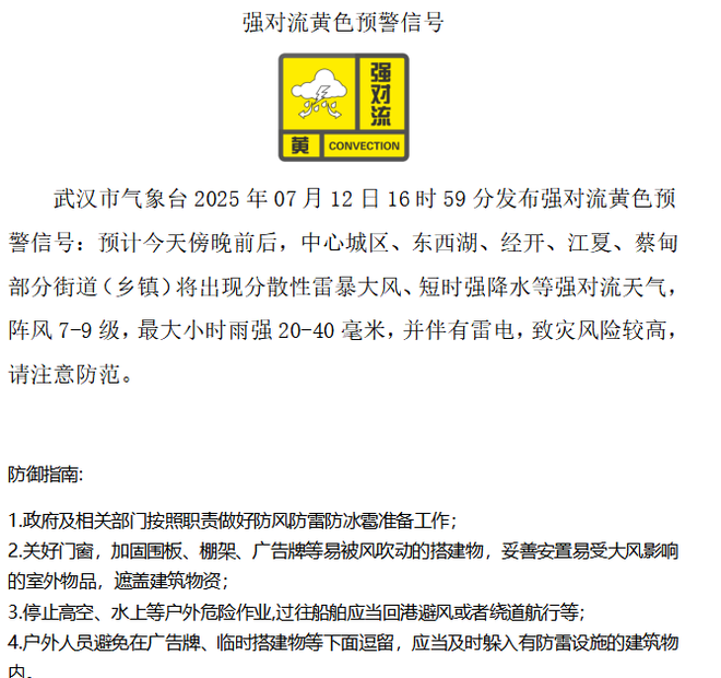 武汉市发布强对流黄色预警,提醒市民关好门窗以防风雨突袭,强对流天气可能带来剧烈的风雨、雷电等天气现象,市民需做好防范措施,确保安全,请广大市民密切关注天气预报,及时做好相关准备。