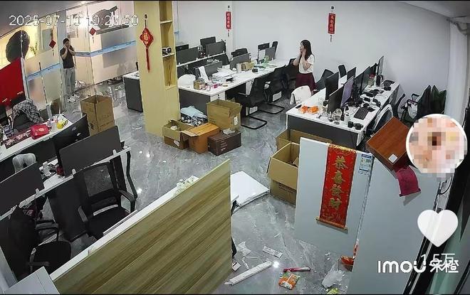 视频显示,事发地为广东某地,一间办公室内原本安安静静,一名年轻女子坐在一排电脑跟前工作,画面近端放着一台白色冰箱。