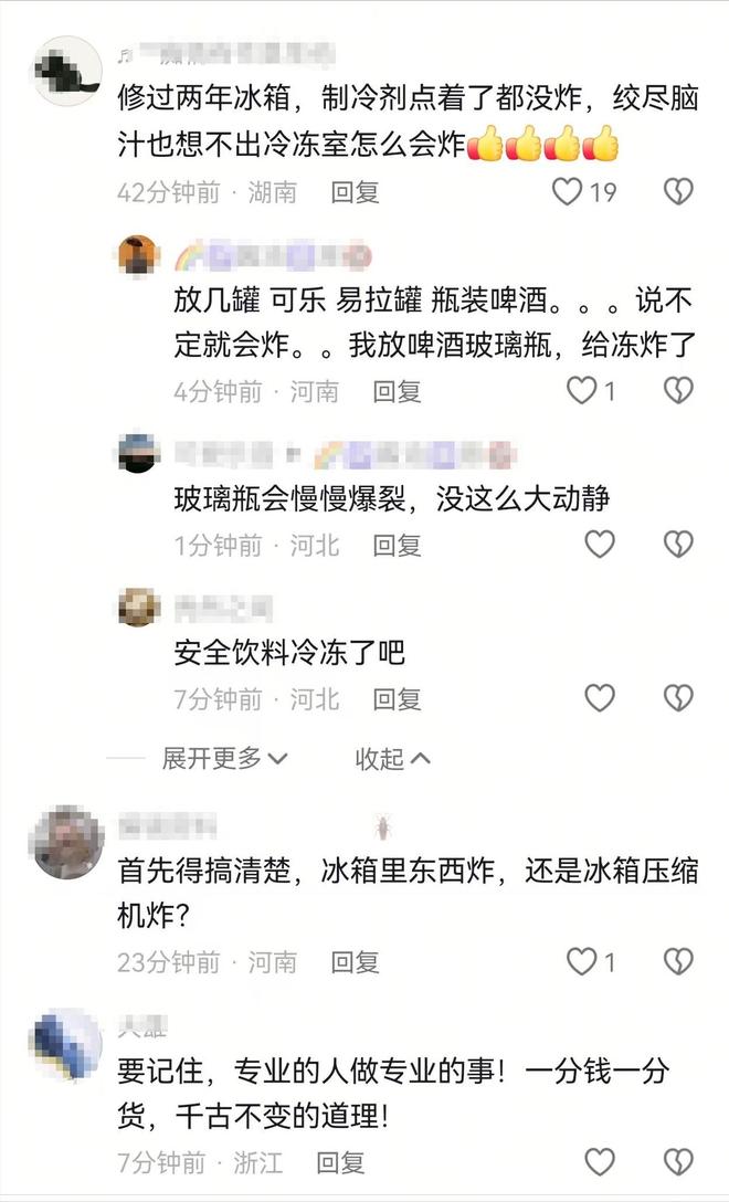 也有网友分析或许是因为冰箱内放置了啤酒、干冰等不适宜冷冻的危险物品才导致了爆炸。