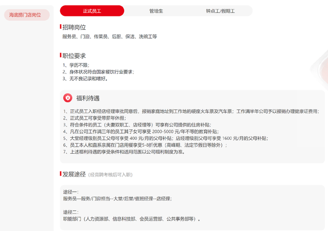不过特色才艺岗不是应聘制,而是分配制。入职海底捞门店后,除了定向管培生,所有人都会从最基础的服务员做起,一般不存在“直接空降才艺岗”的情况。
