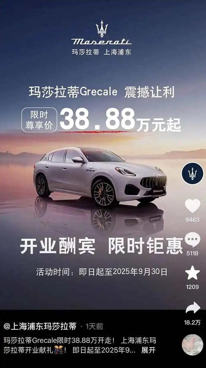 名为“上海浦东玛莎拉蒂”的账号发布海报称,玛莎拉蒂的SUV车型Grecale(格雷嘉)限时尊享价38.88万元起,活动时间截止到9月30日。官方信息显示,玛莎拉蒂Grecale的指导价为65.08-103.88万元,相比之下该经销商的起售价低了26.2万元。