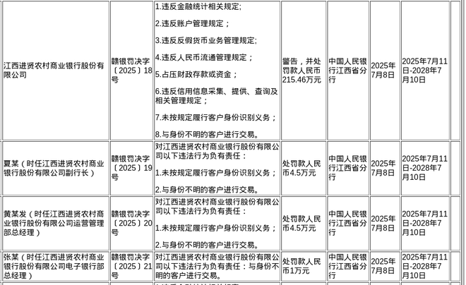 麻辣新闻7月12日讯,近日,中国人民银行江西省分行发布了罚单,剑指江西进贤农村商业银行股份有限公司及其相关责任人。
