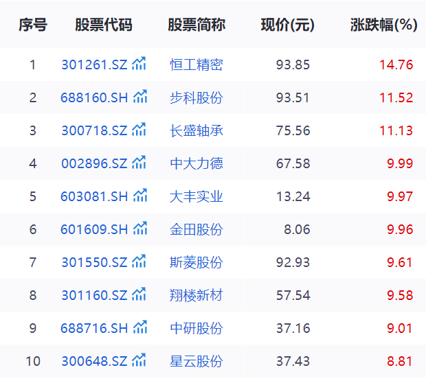 行业板块方面,人形机器人概念股涨幅居前。截至收盘,中大力德(002896.SZ)、大丰实业(603081.SH)、金田股份(601609.SH)等多股涨停,恒工精密(301261.SZ)、步科股份(688160.SH)、长盛轴承(300718.SZ)涨超10%。