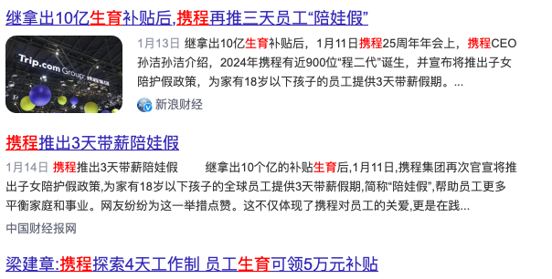 5.界面新闻,《继拿出10亿生育补贴后,携程再推三天员工“陪娃假”》,2025.01