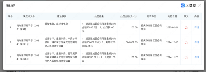 2024年11月到今年1月,重庆新里程控股的盛景医院被当地医保局三次处罚,违规行为包括过度诊疗、重复收费、串换诊疗项目、将不属于医保支付范围的纳入医保基金结算被处罚。根据处罚结果,该医院被要求退回医保基金损失超30万元。