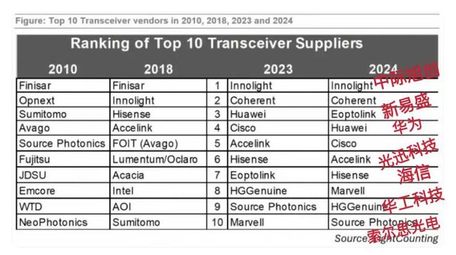 目前,中国光模块厂商在全球市占率已达70%(TOP10中占7席),中际旭创、新易盛等企业在800G和1.6T市场占据主导地位。