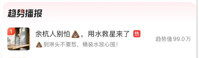 美团也开始追热点。打开外卖 App,搜索栏赫然跳出一句热搜式文案:“余杭人别怕,用水救星来了”。副标题还补刀:“到淋头不要怂,桶装水放心囤!”网友瞬间破防:“这谁写的文案?太逆天!”、“矿泉水直接排第一,笑到缺氧”、“吃屎都要走水表了”,评论区笑骂齐飞。