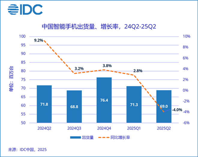 今日,IDC中国发布了2025年第二季度中国智能手机出货量报告,并公布了中国前五大手机厂商的市场排名。数据显示,第二季度中国智能手机市场出货量为6896万部,同比下降了4.0%。这一数据标志着市场结束了连续六个季度的同比增长,并呈现出一定的下滑趋势。