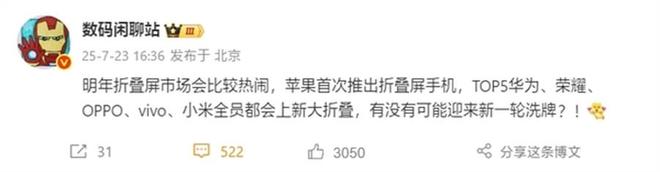 苹果计划在明年发布首款折叠屏手机,这一消息几乎已经得到确认。而与此同时,安卓阵营的厂商们,如华为、OPPO、vivo等,也纷纷蓄势待发,准备在折叠屏市场展开激烈竞争。值得注意的是,今年在折叠屏市场缺席的小米,将在明年重新回归,加入这场大混战,推出新款折叠屏设备。