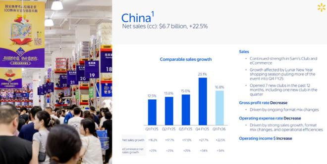 中国市场的优异表现,也正是撬动沃尔玛增长的火车头。沃尔玛2026财年一季报显示,截至2025年4月30日的单季内,沃尔玛国际市场会员费收入增长22%,由山姆中国引领增长,若想持续提升会员费收入,就需要继续扩张门店规模。