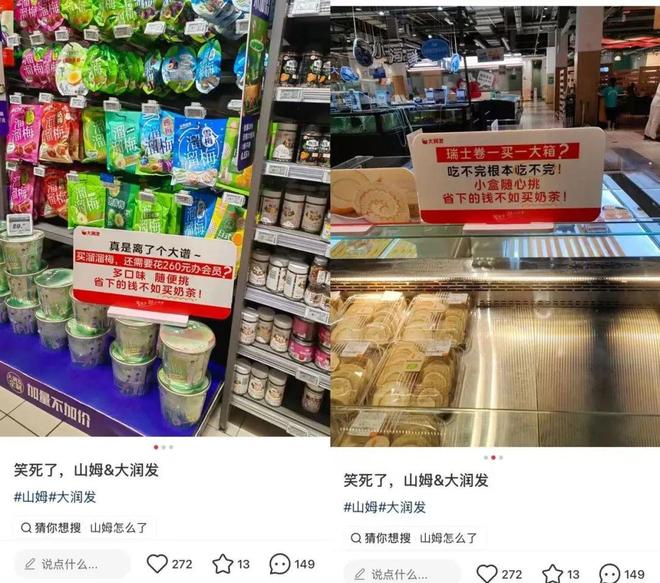 曾经的"超市之王"大润发也没有错过流量。有消费者在逛大润发的时候,溜溜梅、瑞士卷等山姆同款上有了新的商品标签:"真是离了个大谱,买溜溜梅,还需要花260元办会员?"