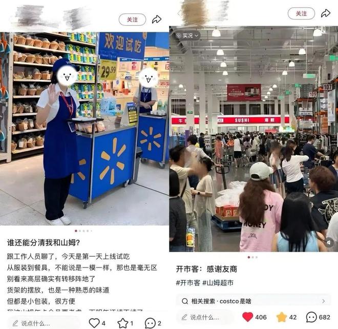 在社交媒体上,不少山姆"信徒"也分享自己转战开市客的体验——一样的外资超市,类似的仓储货架、各类试吃和价格接近的会员费,除了距离太远外,开市客似乎成了新的选择,甚至有网友调侃:"我带山姆会员卡,能否办卡半价"。
