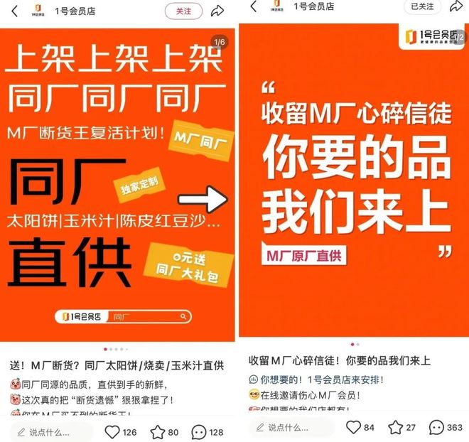 还有的会员店则直接打出了"收留M厂心碎信徒"的口号,京东旗下会员制超市一号会员店直接官方下场,推出了"M厂同厂直供"的计划,有用户在评论区直接在线许愿山姆下架产品,官方复刻同款。