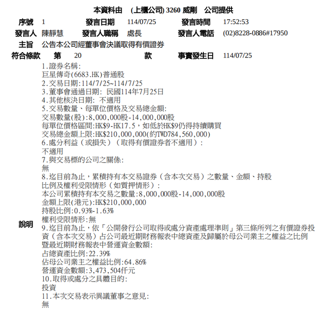 7月25日,全球第二大、亚洲第一大存储器(DRAM)模块及SSD生产商威刚科技公告,经董事会决议取得巨星传奇普通股份,交易数量8,000,000股-14,000,000股,每单位价格区间9港元-17.5港元,持股比例0.93%-1.63%,投资金额上限达2.1亿港元。