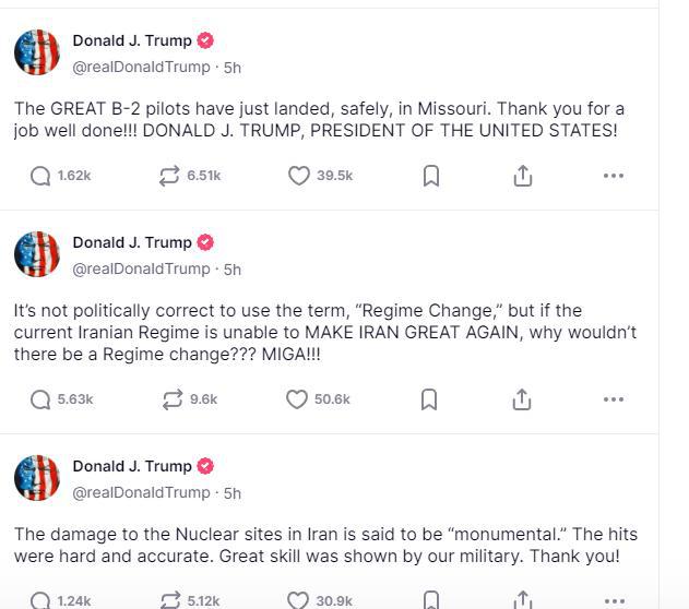 特朗普另一条帖文为美军打击核设施点赞,称伊朗核设施遭受的破坏“巨大”,“打击既猛烈又精准”,美军“展示了高超技能”。最后一条帖文宣告,实施打击行动的美军B-2轰炸机已安全降落在密苏里州。