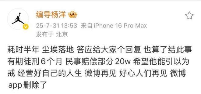 7月31日,李明德砸车事件迎来新进展。车主编导杨洋发文称:“耗时半年,尘埃落地,答应给大家个回复,也算了结此事。有期徒刑6个月,民事赔偿部分20w,希望他能引以为戒,经营好自己的人生。”