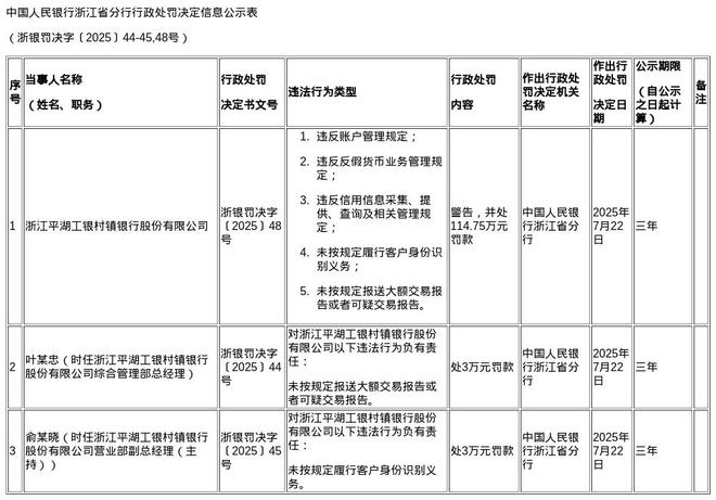 麻辣新闻7月31日讯,近日,中国人民银行浙江省分行发布了罚单,剑指浙江平湖工银村镇银行股份有限公司及其相关责任人。
