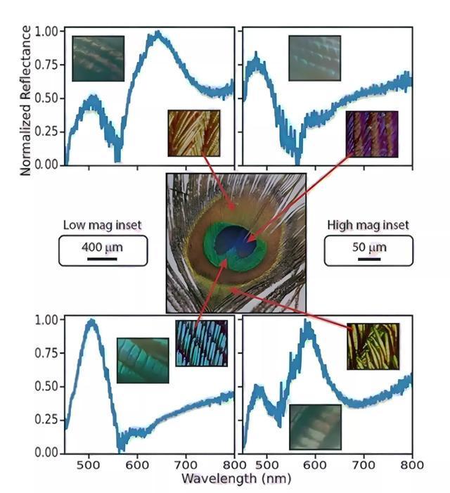 孔雀尾羽眼状斑的图像,周围环绕着四个不同颜色区域的反射光谱。每个光谱都有两张插图,一张是该颜色区域的低倍显微镜图像,另一张是高倍显微镜图像。