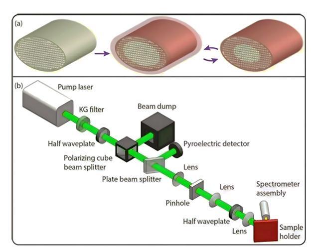 (a)用染料溶液反复染色的小羽枝横截面的图示。 (b)用于检测用 R6g 染色的雄性印度孔雀尾羽发射的实验装置。