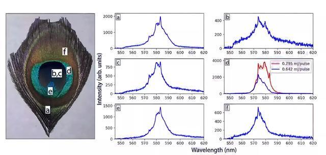 当激光照射到眼斑的不同部位时,无论这些部位呈现蓝色、绿色、黄色还是棕色,研究人员都发现了尖锐且一致的激光发射峰,尤其是在574nm和583nm波长处。这些线条在染料的泛荧光中格外醒目,并且出现在所有测试的羽毛样本和颜色区域,表明该效果具有可重复且稳定的特性。