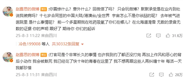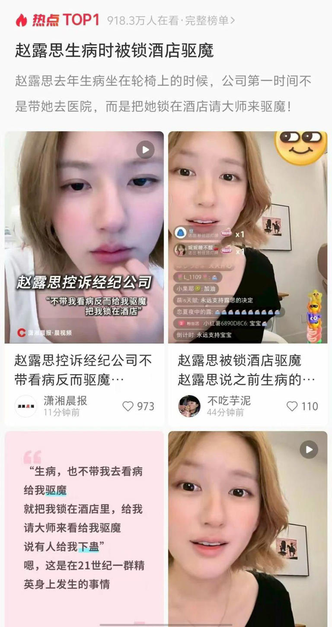 8月3日,"银河酷娱取关赵露思"冲到热搜第一。赵露思转发银河酷娱传媒的声明,并配"绿茶"表情发出"八问"。此后,赵露思在抖音开启了个人直播,直播标题配文"没疯,谢谢",后在小红书直播,直播中透露的想开面馆、甜品店闭店、被经纪公司关酒店驱魔等相关事件,均登上热搜。