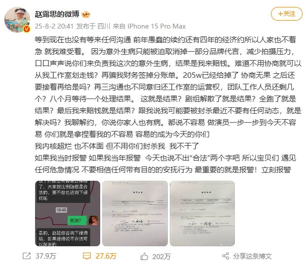 7月8日,网友发现赵露思社交平台主页的"银河酷娱MCN"认证标识消失。上周六晚八点半,赵露思选择手撕自己的经纪公司银河酷娱,控诉公司"多宗罪",未经协商划走工作室账户205万元赔偿代言损失、诱导签署分账单、工作室运营权归属、解约无果等。这新的一集堪称是年初生病停工、争议满天飞的个人定制综艺《小小的勇气》之后,顺理成章的续集。