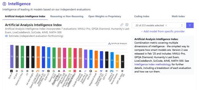 Artificial Analysis平台提出了一项名为"Artificial Analysis Intelligence Index(AAII)"的综合性评测基准,汇总了7个极为困难且专注于前沿能力的单项评测结果。