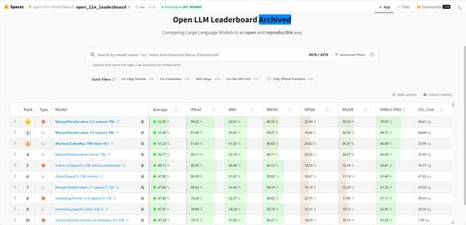 而HuggingFace也有类似的开源大语言模型榜单,测评标准中包含了前面提过的MATH、GPQA和MMLU-Pro: