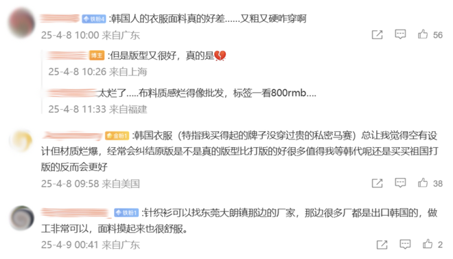 变贵的基础上,质量就显得更值得商榷了。社交平台上不乏“对韩国衣服祛魅”的感慨,“超绝地摊货”“贫穷女大感”“又贵又廉价”是其中高频关键词。
