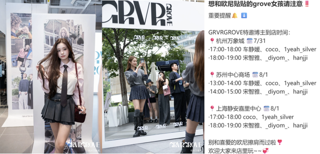 GRVRGROVE在江浙沪的三家新店,就请来了韩国知名真人秀明星宋智雅、韩国演员车静媛和好几个Instagram网红博主站台,和到店顾客合影互动。