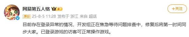 8月5日上午,网易旗下多款游戏突发崩服,包括《阴阳师》《第五人格》《七日世界》《一梦江湖》等。网易办公系统“POPO”也同步出现异常,引发大量用户反馈。据网易内部人士透露,本次故障为“机房网络问题”,受影响范围较广,服务器重启和排查都需时间,目前已陆续修复并发放补偿。