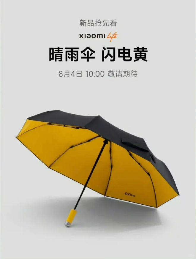 8月3日,雷军在微博宣布:“最近很多地方都在下雨,我们为小米车主们做了把雨伞。”这把Xiaomi Life晴雨伞采用小米汽车同款撞色设计,定价169元,可用1690积分兑换,8月4日起在小米汽车App开售。外观为黑黄撞色,伞柄印有“Ultra”标识,并适配小米汽车门板收纳槽。