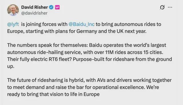它们也证实了国际出行巨头对无人驾驶的热情,到了争先恐后的地步。合作官宣当天,Lyft CEO David Risher连夜在LinkedIn上分享了这个好消息:"萝卜快跑是全球规模最大的自动驾驶出行服务平台,第六代车是专为自动驾驶而生的无人车。这意味着我们能将无人驾驶出行服务,连同安全、可靠与隐私保护,带给数百万欧洲用户。"
