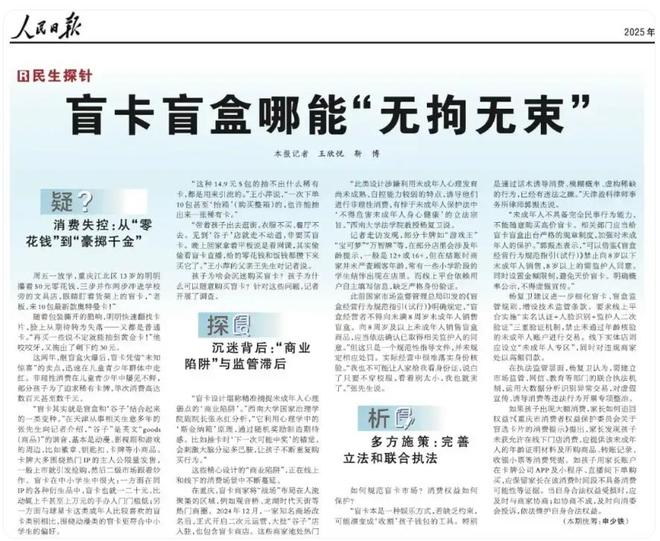 6月20日,《人民日报》发表文章《盲卡盲盒哪能“无拘无束”》指出,这两年,继盲盒火爆后,盲卡凭借“未知惊喜”的卖点,迅速在儿童青少年群体中走红。非理性消费在儿童青少年中屡见不鲜,部分孩子为了追求稀有卡牌,单次消费高达数百元甚至数千元。如今,盲卡早已超越简单的收藏功能,变成儿童青少年社交圈里的“硬通货”。而在未成年人沉迷的背后,也存在“商业陷阱”与监管滞后的问题。