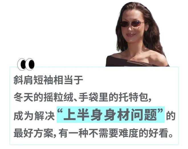 斜肩短袖相当于冬天的摇粒绒、手袋里的托特包,成为解决“上半身身材问题”的最好方案,有一种不需要难度的好看。