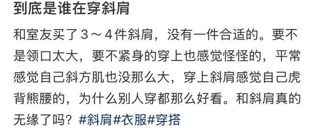 因为增加了露肤程度,所以“第一次感受到自己斜方肌这么大”,再加上驼背和胸大,“怎么说好的谁穿谁美丽,到我手上就变成了虎背熊腰?”