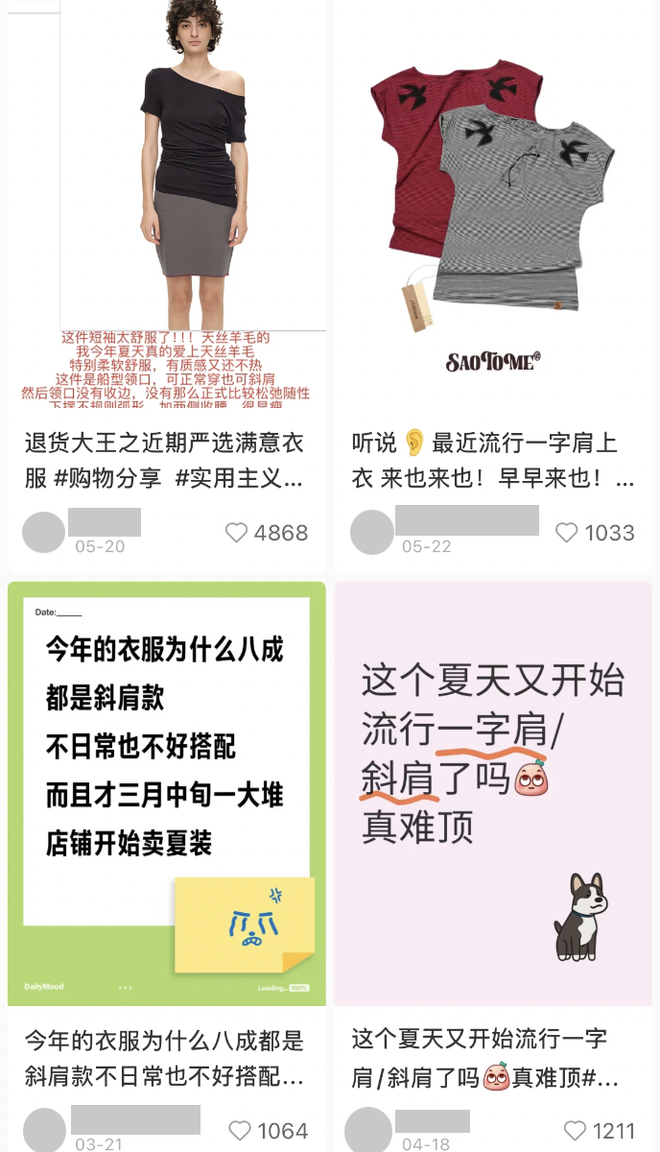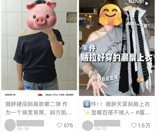 斜肩女装上衣五花八门、无处不在,“仿佛肩膀不漏风不能进商场货架”。