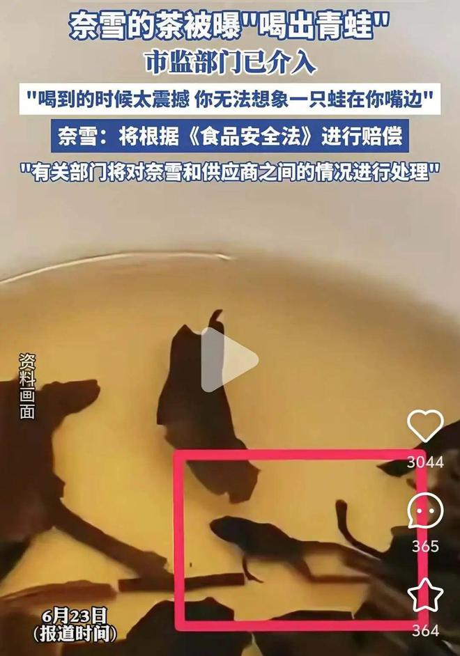 6月21日,有网友在社交平台发帖称,在“奈雪的茶”一门店购买的预包装茶包“小盒茶”中发现一整只青蛙。前5包饮用时未发现异样。但6月21日饮用最后一包时,发现茶内有疑似青蛙的物体。