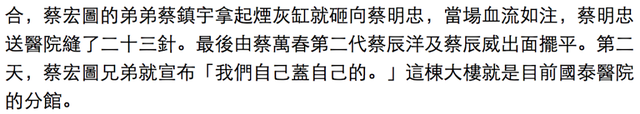 比如2001年,蔡万霖的三儿子蔡镇宇,就知道拿烟灰缸砸了蔡万才的大儿子蔡明忠,导致后者头破血流、送医缝针,最后还是蔡万春家的儿子们出面调解。