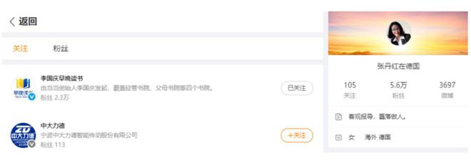 李国庆和张丹红是什么时候擦出爱情的火花的?李国庆没有披露,在微博平台李国庆关注了张丹红的账号,张丹红也关注了李国庆和李国庆早晚读书账号,而据张丹红微博显示,最新关注的正是李国庆。张丹红还开通了短视频账号,IP显示在北京。目前张丹红视频号橱窗中仅有一件商品,为书籍“敢当:李国庆创业人生和商业逻辑”。可见两人之间的亲密关系。