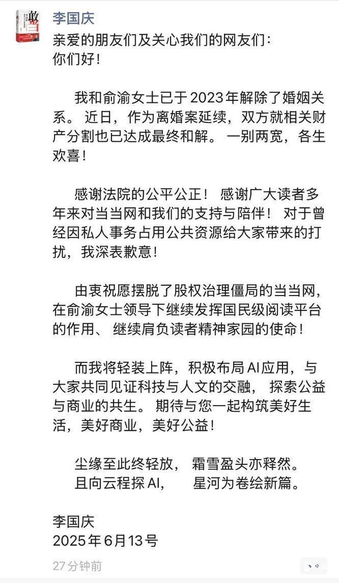 李国庆在6月13日完成和俞渝的财产分割后,在微博上表示自己将积极布局AI应用。