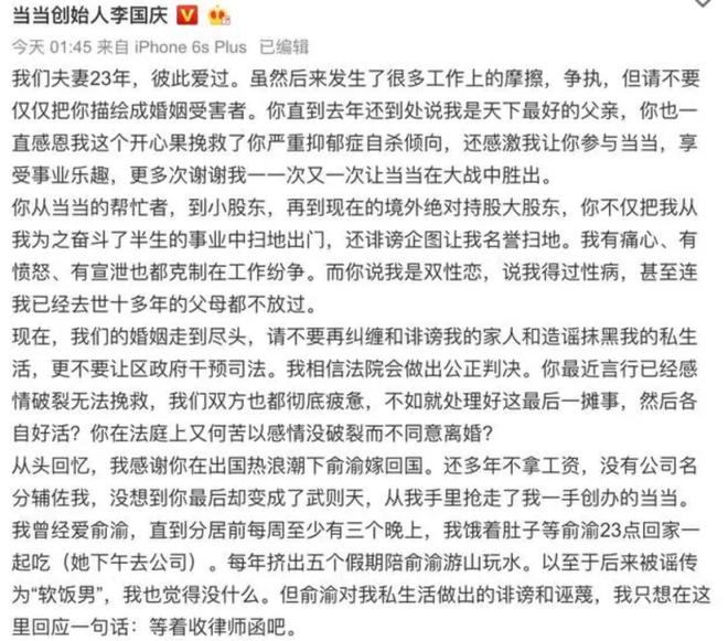 李国庆和俞渝的决裂早在2019年就开始了,在长达6年的“庆俞年”大战中,吃瓜群众看到两人不止一次的互撕。2019年10月23日晚间,俞渝在朋友圈开撕丈夫李国庆,直指其同性恋、撒谎、不顾家,且患有梅毒等内容。10月24日凌晨,李国庆再次发布微博回应俞渝的朋友圈爆料,“请不要仅仅把你描绘成婚姻受害者。不想揭露你伪善嘴脸,爱过请珍惜”。两人的互撕一度成为互联网圈内的笑料。