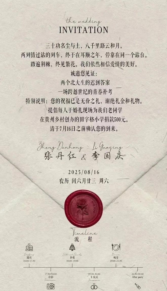 从两人精心设计的婚礼请柬可以看出,两人的爱情充满诗情画意的浪漫,“八千里路云和月”最终停靠在同一站台,“两个北大生的迟到答卷,一场跨世界的青春补考”更是把李国庆的心迹展露无遗。有意思的是李国庆在请柬上明确注明谢绝礼金和礼物,提倡为贵州乡村的田字格小学捐款500元。田字格公益是李国庆北大校友肖诗坚创办,这波操作又为李国庆的再婚赢得不少赞誉。