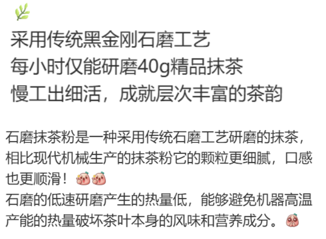 不过,这似乎让“人工石磨”更加成为了一种卖点。“慢工出细活”“匠人匠心”“传统情怀”,就像我们所熟知的很多日本标签显著的商品,类似语句也常出现在兜售抹茶的话术中。